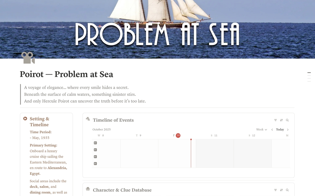 Organize your mystery notes with this fun, fan-made Notion guide! Track episodes, characters, and personal thoughts. A hobby project created for fans to enjoy and stay organized while watching classic Poirot mysteries.