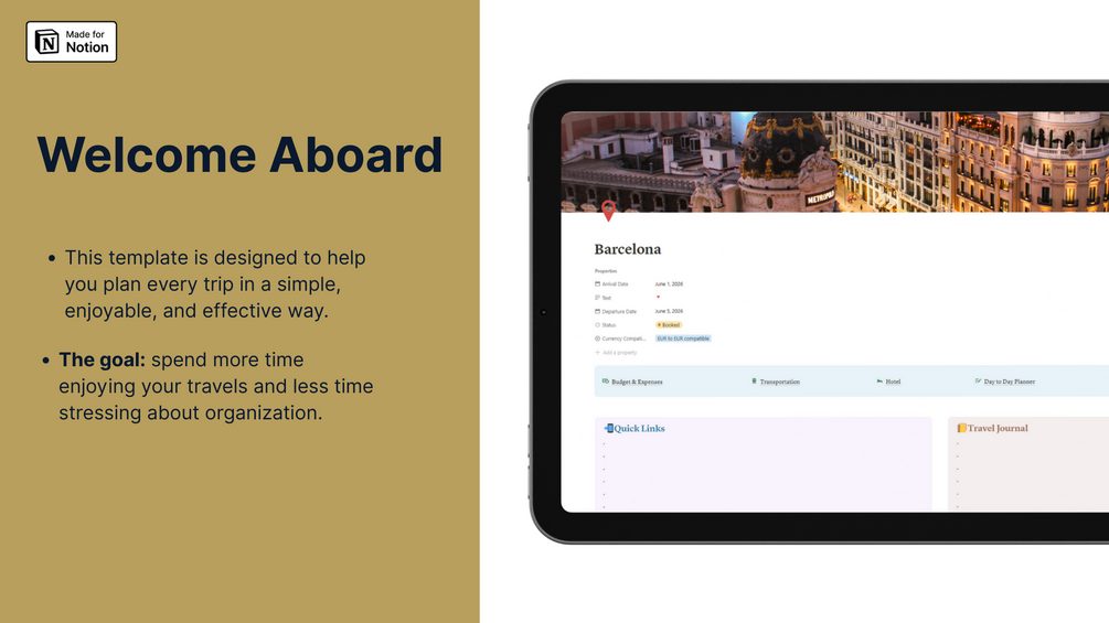 Whether it’s a weekend getaway or a month-long adventure, this template makes travel stress-free and lets you focus on the fun, not the logistics.